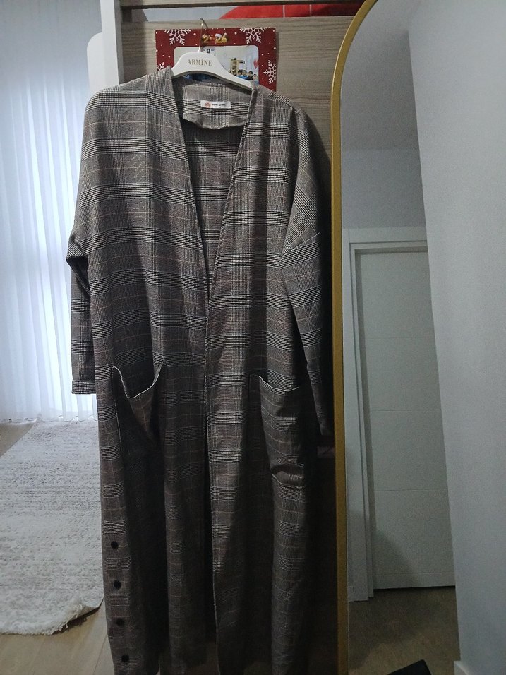 Gri keten kumaştan, düğmeli, uzun ve bol kesim kadın kaban. Uzun kollu ve cepli, günlük kullanıma uygun bir model. marka temsilidir