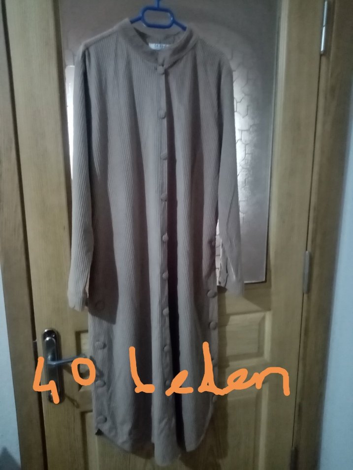 Nefes alabilen keten kumaştan yapılmış, düğmeli önü ve uzun kollu gri uzun tunik. Salaş kesimi ve yuvarlak yakası ile kalın kumaştır