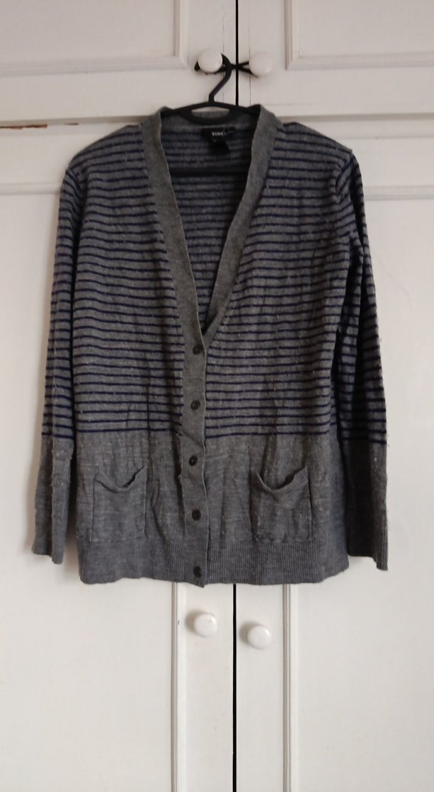 Düğmeli, uzun kollu, keten kumaştan gri kadın hırka. Salaş kesim, kesik yaka ve normal midi boyda. İnce çizgili, iki cep detaylı, günlük kullanıma uygun.