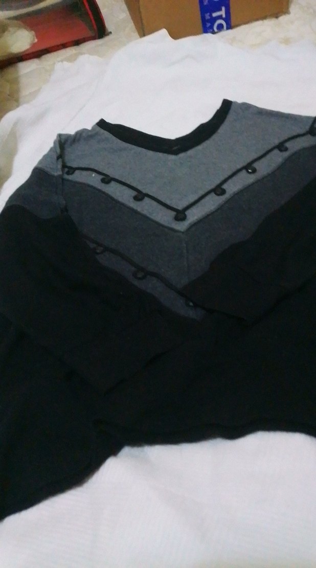 Gri, düğmeli, uzun kollu ve yuvarlak yakalı, gevşek kesim kadın kazak. Tekstil malzemeden, gotik tarzda ve günlük kullanıma uygun.