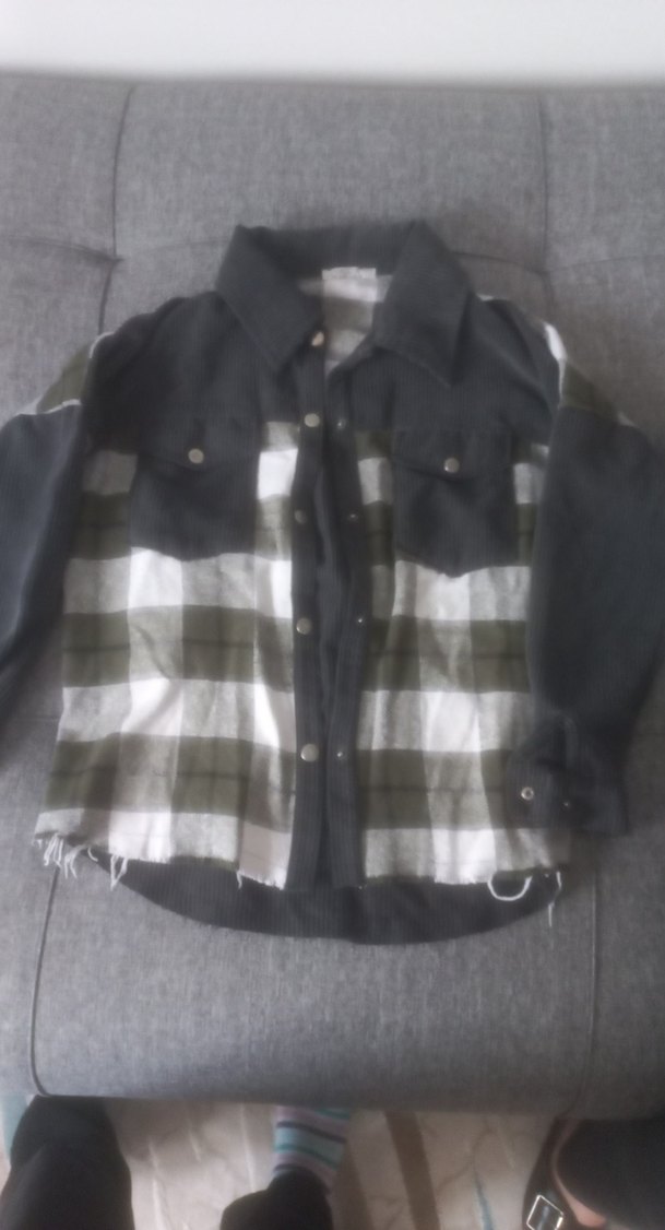 Gri tonlarda düğmeli, uzun kollu, salaş kesim kadın gömlek. Ekose desenli, notched lapel yakalı ve midi boyda, günlük sokak tarzına uygun.