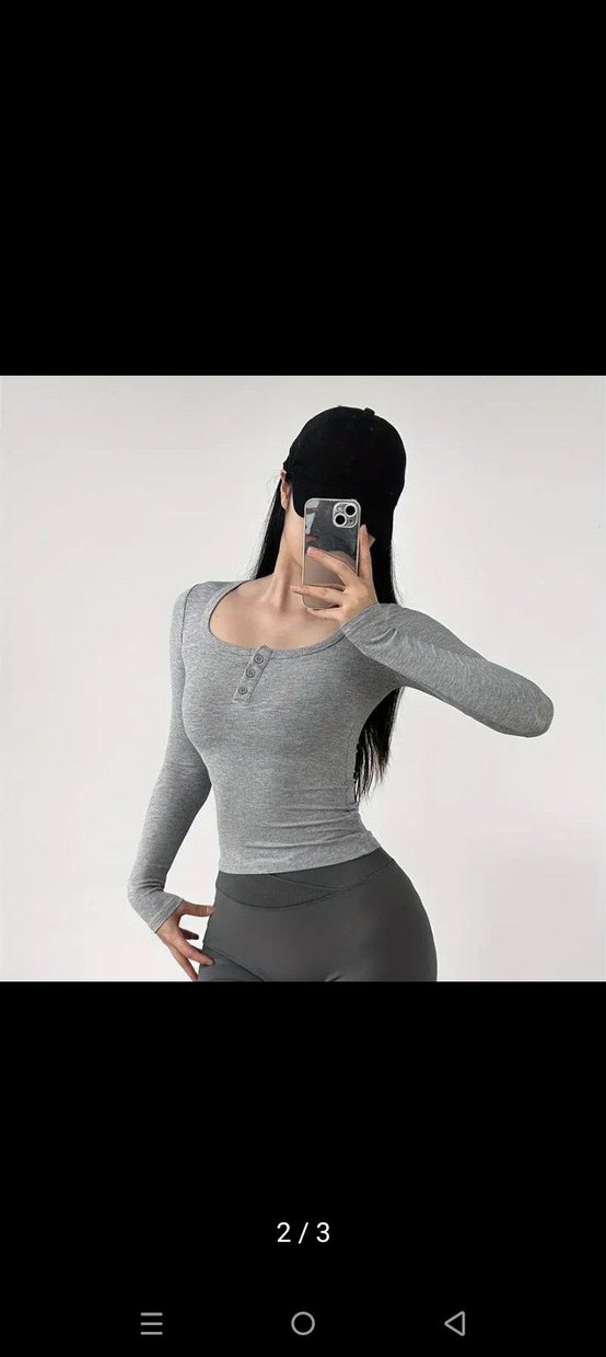 Düğmeli yuvarlak yakalı, gri renkli, uzun kollu, spor ve sokak stiline uygun, vücuda oturan bluz. ♀️