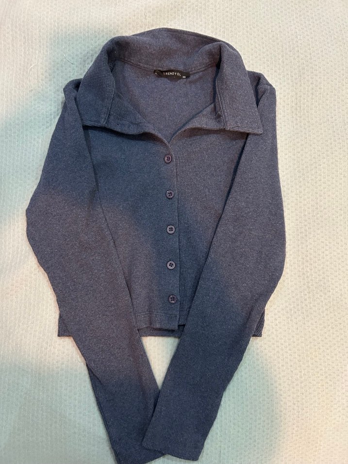 Düğmeli ve yakalı gri triko hırka, uzun kollu ve normal boydadır. Yumuşak dokusuyla rahat ve gündelik kullanım için uygundur.