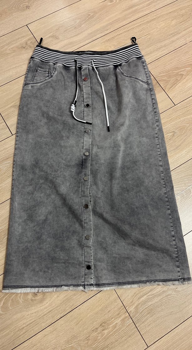 Gri uzun kot etek, düğmeli ön ve çizgili lastikli bel ile bağcıklıdır. Salaş kesimi ve günlük kullanıma uygun rahat tarzı vardır. 38-40 bedene kadar rahat uyar Hiç Giymedim