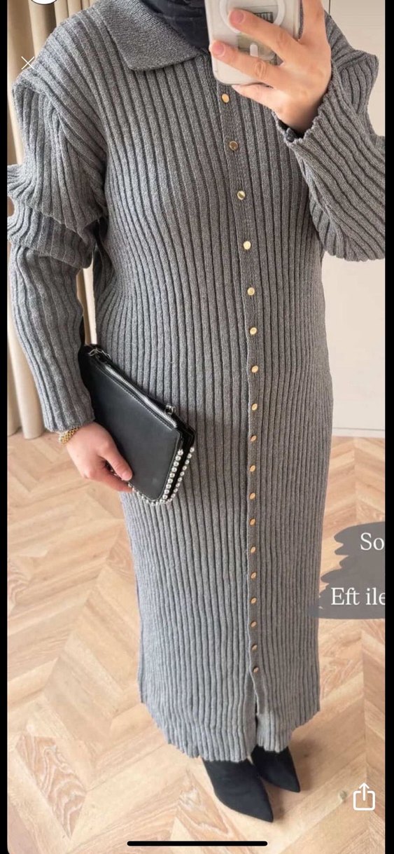 Düğmeli, uzun gri triko elbise, uzun kollu ve balıkçı yaka detaylıdır. Günlük kullanıma uygun, rahat ve trend sokak stili sunar. Hiç giyilmedi etiketli butik ürünü