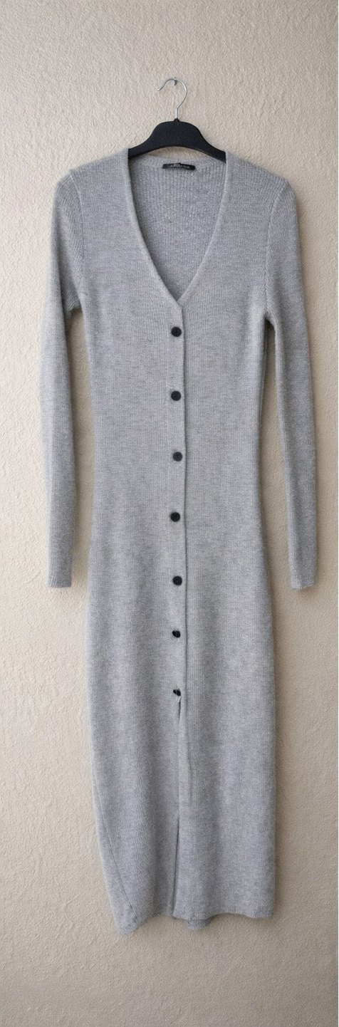 Düğmeli, uzun kollu, gri triko elbise, fitted kesim ve yakasında kesik detay bulunur. Rahat ve sade normcore tarzında, günlük kullanım için uygundur.