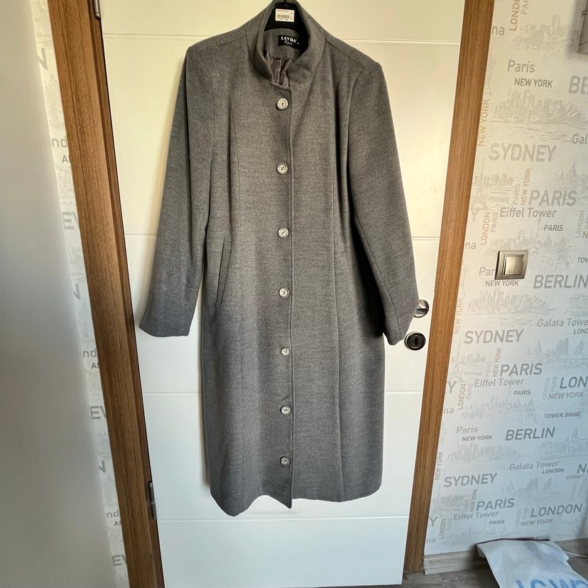 Düğmeli ön ve çentikli yakaya sahip uzun gri yün kaban. Bir kere giyildi