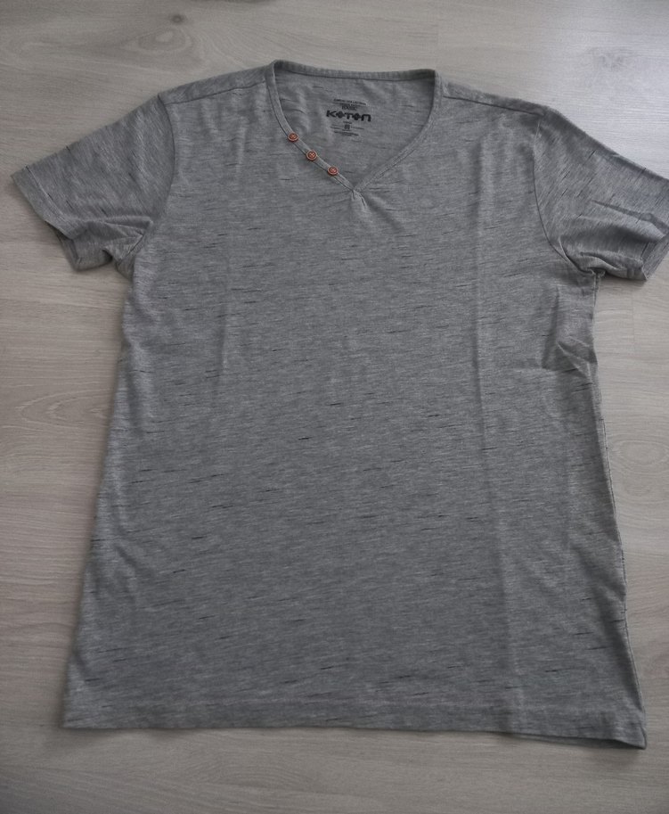 Gri renkte, düğmeli V yaka kesim erkek tişörtü. Günlük rahat kullanıma uygundur.