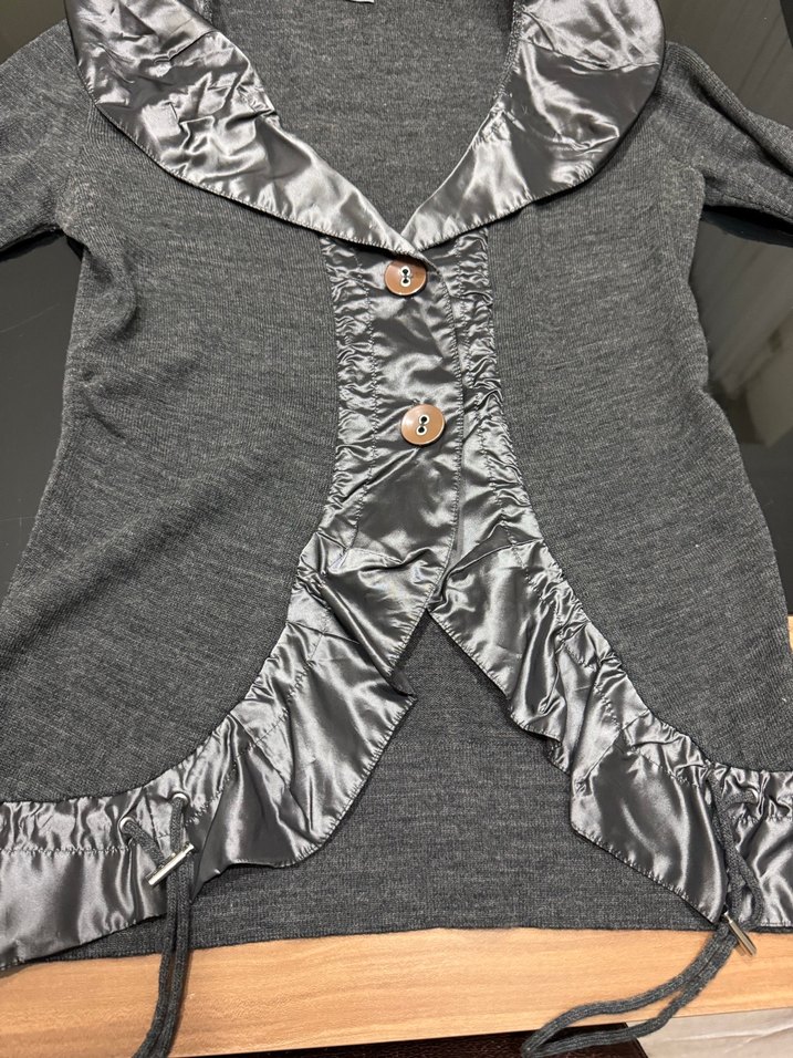 Düğmeli, V yakalı, grihırka parlak saten detaylarla süslenmiştir. Uzun kollu, midi boyda ve yumuşak triko ve tafta kumaştan yapılmıştır.