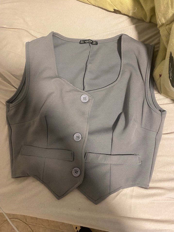 Düğmeli, V yaka, kolsuz gri kadın yelek. Fitted kesim, midi boy ve günlük kullanıma uygun yumuşak sentetik kumaştan üretilmiştir.