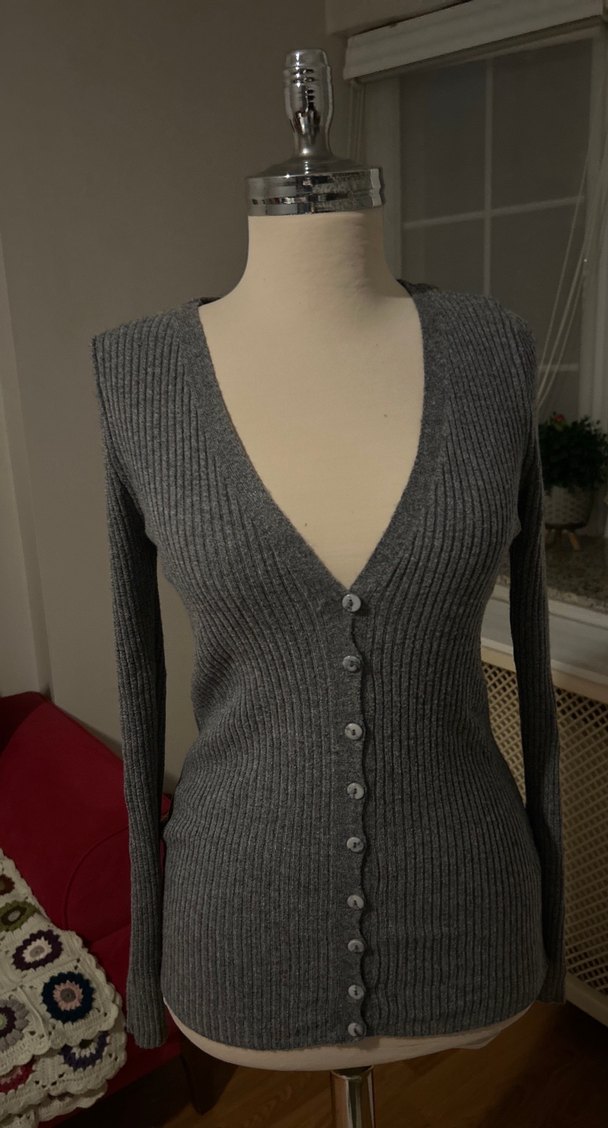 Düğmeli, V yakalı, uzun kollu, yumuşak triko kumaştan yapılmış, gri, vücuda oturan midi uzunlukta kadın hırkası.