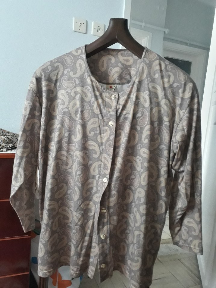 Uzun kollu, yuvarlak yakalı, düğmeli ve bol kesim bluz. Nefes alabilen kumaştan, vintage desenli, günlük kullanım için uygun.