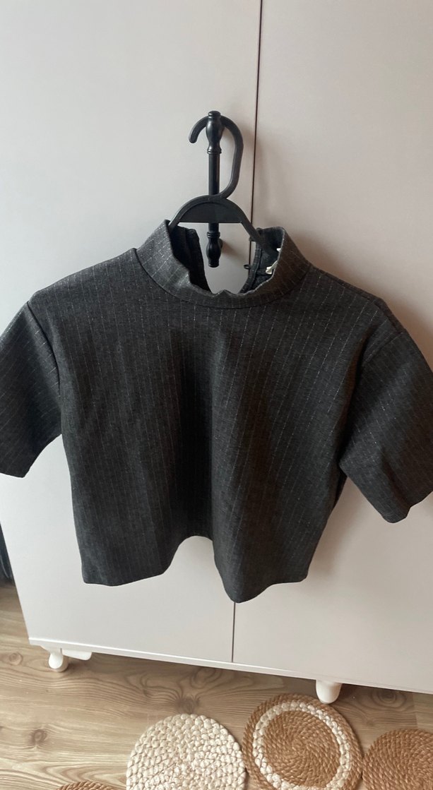 Düğmeli, yüksek yakalı, kısa kollu gri crop top. Sıkı kesim ve sentetik kumaştan üretilmiştir. Günlük sokak stili için uygundur.
