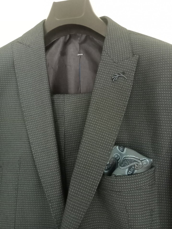 Gri yılan desenli, düğmeli ve klasik kesime sahip erkek takım elbisesi. Klasik yaka ve modern stil ile ofis kullanımı için uygundur. Kolsuz ve midi boyda.