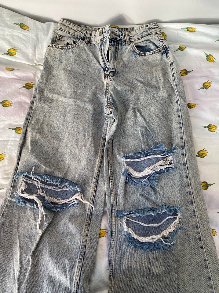 Düğmeli, salaş kesim gri kot pantolon, önünde yırtık detaylarıyla sokak stiline uygun.