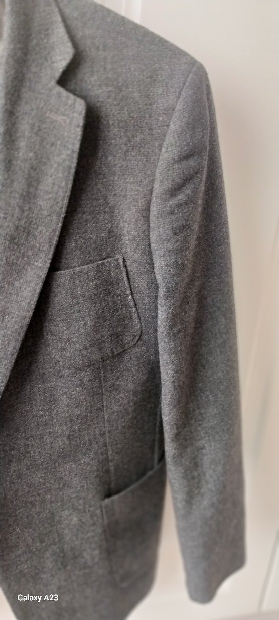 Gri yün kumaştan yapılmış, düğmeli, not kesim yakalı Normal kesim ve