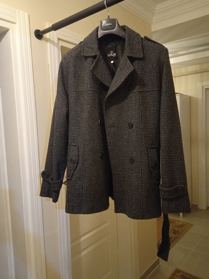 Düğmeli önü ve kırçıllı gri siyah yün kumaştan yapılmış, klasik kesim, normal boy erkek kaban. Uzun kollu ve rahat kalıptadır. boy 80 cm kol boyu 65 cm iki kol arası 53 cm kemerli L beden tertemiz sayılı giyildi kusuru yok