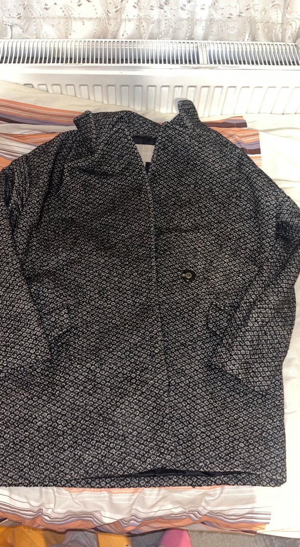 Gri yün , düğmeli, uzun kollu. Rahat bol kesim ve midi boyda, sade ve sokak stiline uygun bir modeldir.