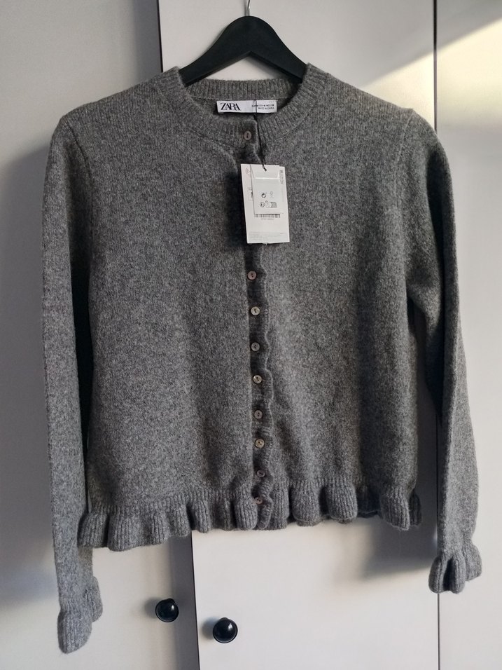 Gri yün hırka, uzun kollu, yuvarlak yakalı ve düğmeli. Rahat kesim ve normal midi boyda, günlük kullanıma uygun.