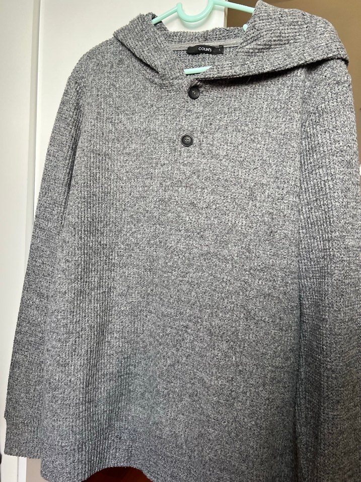Düğmeli, gri yünden yapılmış, bol kesim ve uzun kollu, normal boyda rahat kadın kazak.