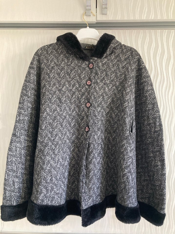 Gri renkte, düğmeli ve yumuşak yün kumaştan yapılmış, bol kesim panço. Uzun kollu, yakası düğmeli ve kürk detaylıdır. Midi uzunlukta, günlük kullanıma uygundur.