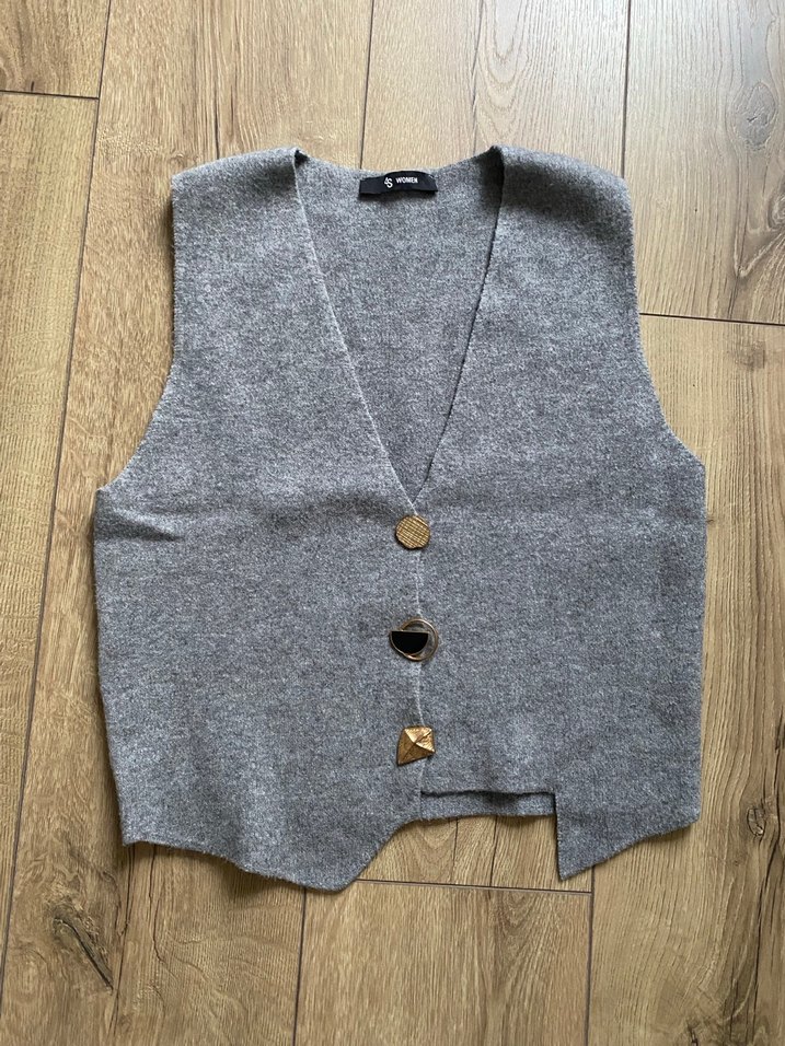 Gri yün, düğmeli, kolsuz yelek. Normal midi boyda, notched yaka ve rahat kesimle günlük kullanıma uygun.