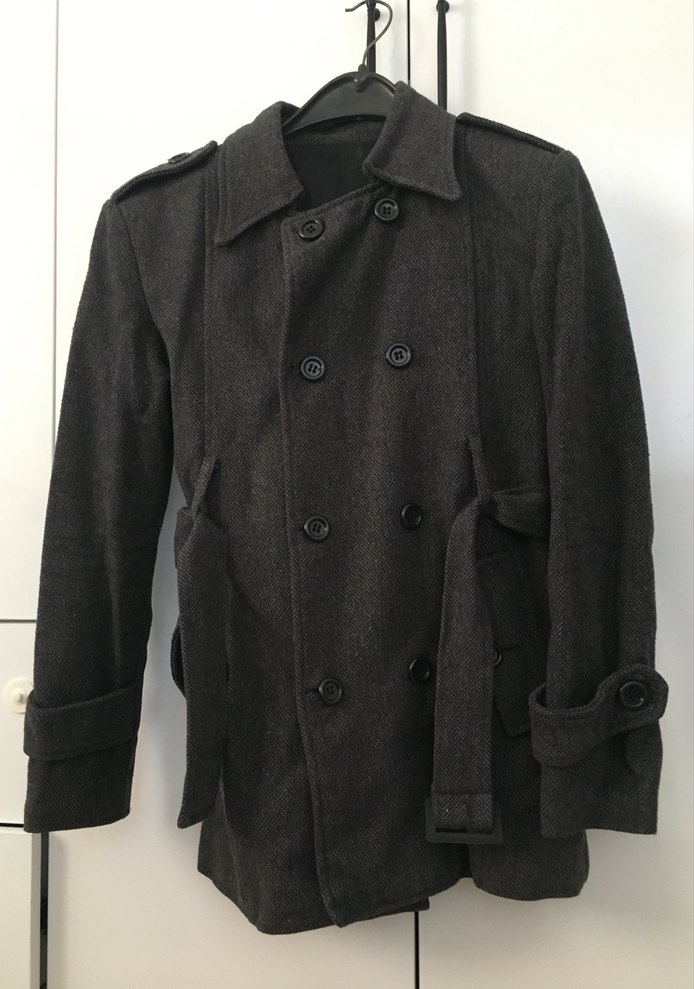 Düğmeli, gri yün kumaştan yapılmış, klasik kesim ve normal uzunlukta erkek kaban. Ofis için uygun, notched yakalı ve regular fit.