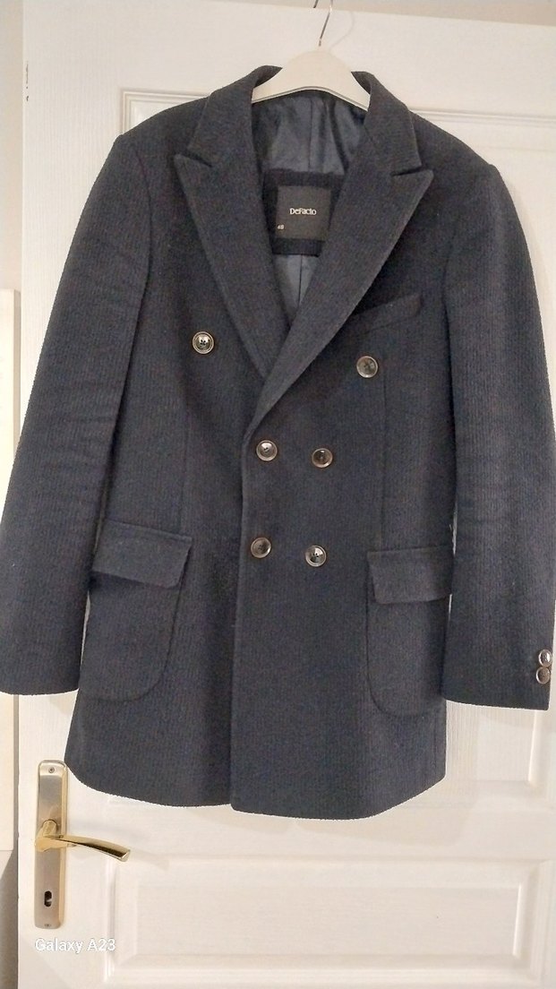 Düğmeli ön kısmı ve yün kumaşıyla siyah renkte, normal kesim ve uzun kollu erkek klasik midi ceket.