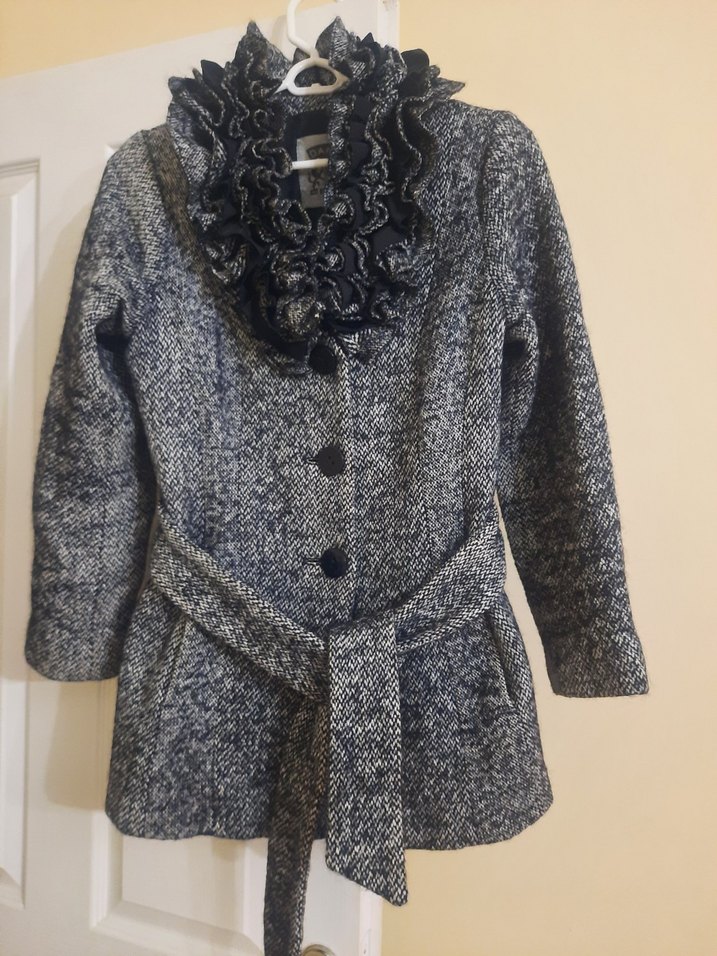 Gri yün kumaştan, düğmeli, desenli ve normal uzunlukta midi kaban Uzun kollu çok temiz 2 defa ancak kullandım temiz ve kusuru yok