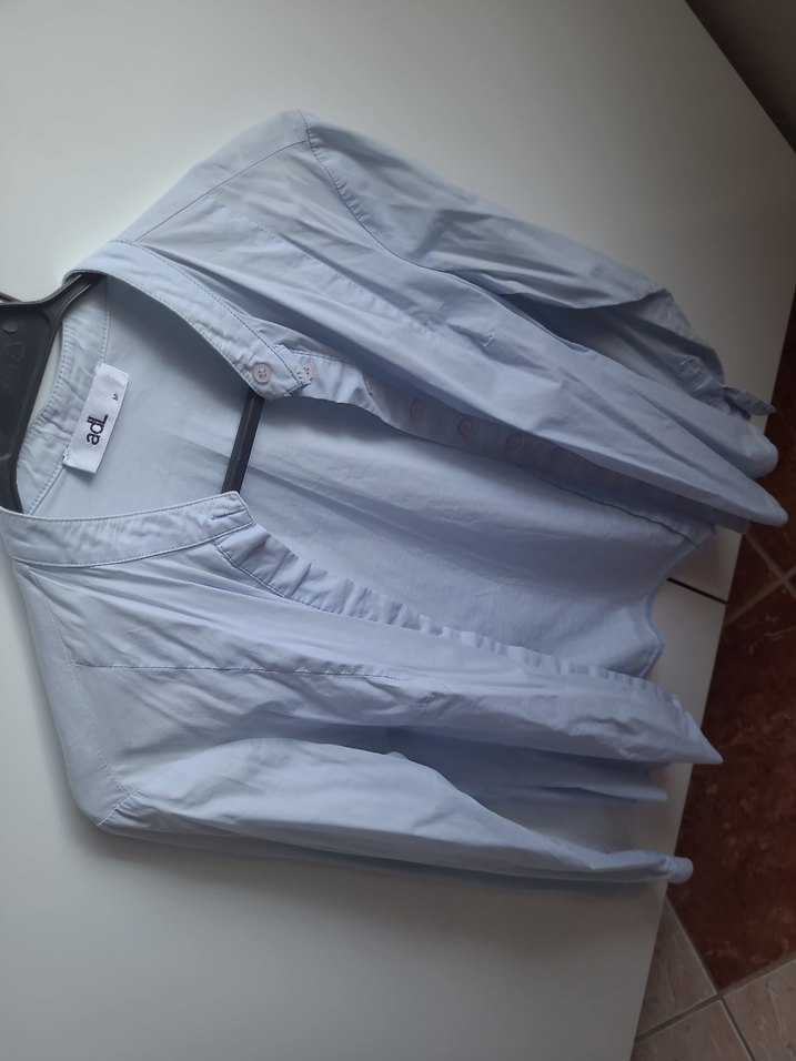 Mavi renkte, yumuşak pamuklu kumaştan yapılmış, düğmeli hakem yaka ve uzun kollu, tam kalip kadın gömlek.