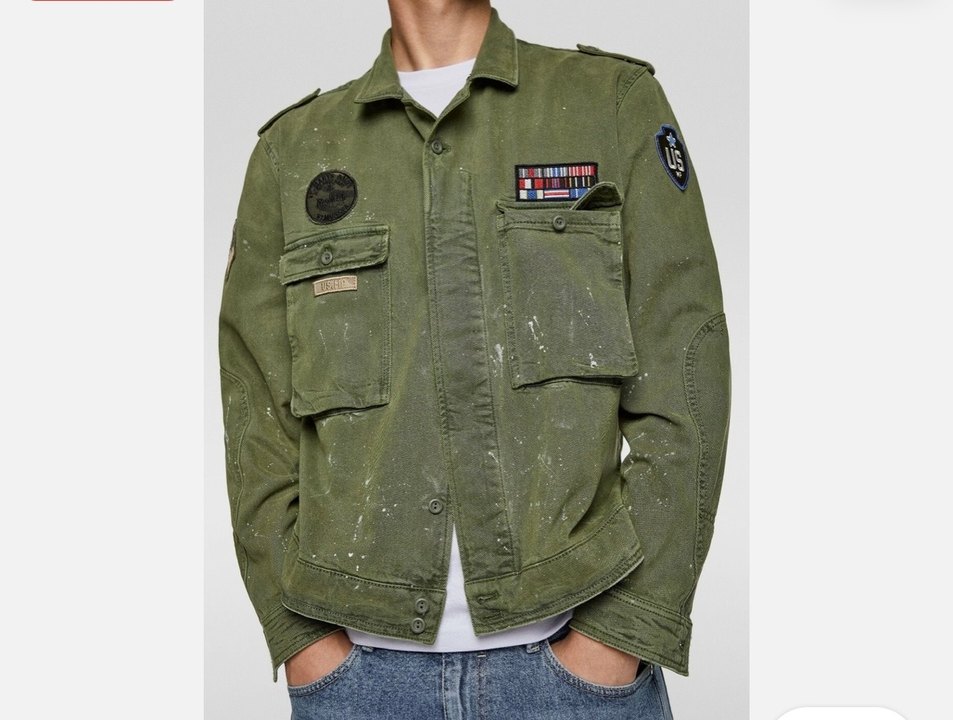 Düğmeli önü, haki renk parlak denim kumaş, kamuflaj desenli erkek ceket. Uzun kollu, normal kesim, yama detaylı cepleriyle grunge punk tarzı. Günlük kullanıma uygun.