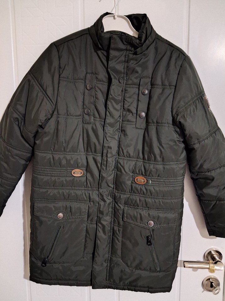 Düğmeli önü ve kesik yaka detaylı, sıcak tutan haki renkli erkek mont. Sokak stiline uygun, çoklu ceplidir.