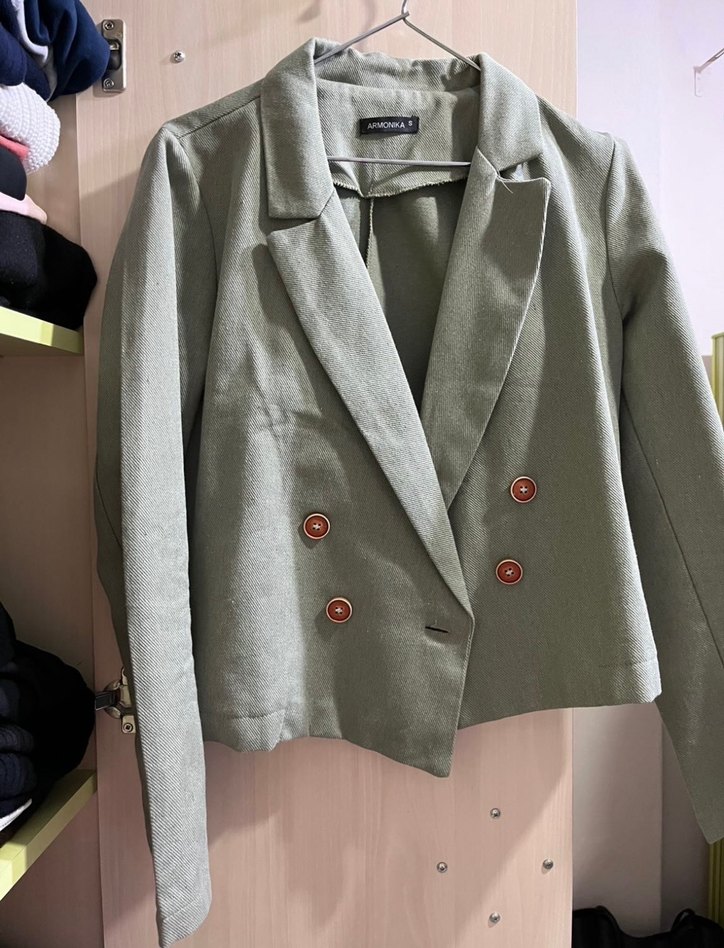 Haki renkli kadın blazer ceket, düğmeli ön ve kesik yaka detayına sahiptir. Uzun kollu, normal kesim ve sentetik dokulu kumaştan üretilmiştir, ofis kullanımı için uygundur.