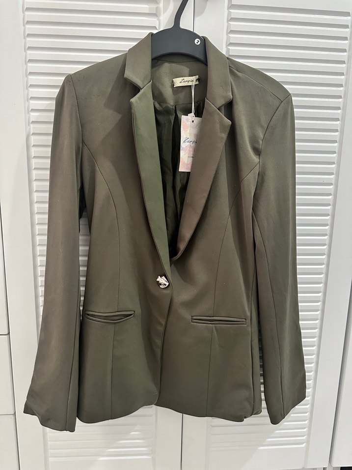 Düğmeli, haki renk kadın blazer ceket, keskin yaka ve düz dokulu sentetik kumaştan üretilmiştir. Ofis ve günlük kullanım için uygundur. Sağ omuz üstünde ufak kusuru var belli olmuyor çok. Fotoğrafta gösterilmiştir