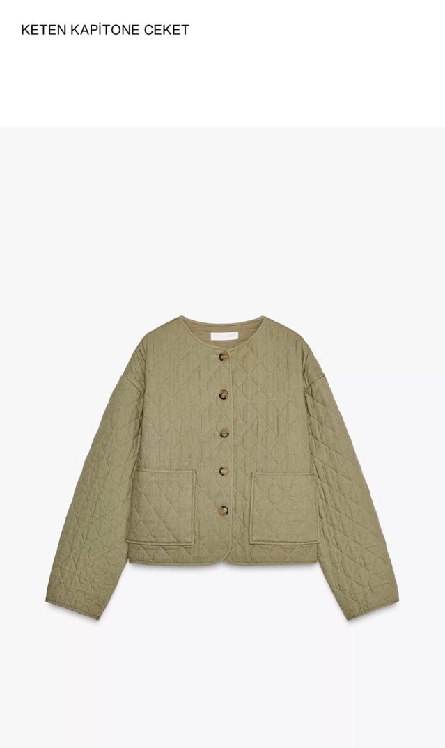 Haki keten kumaştan yapılmış, uzun kollu ve bol kesim kadın midi ceket.