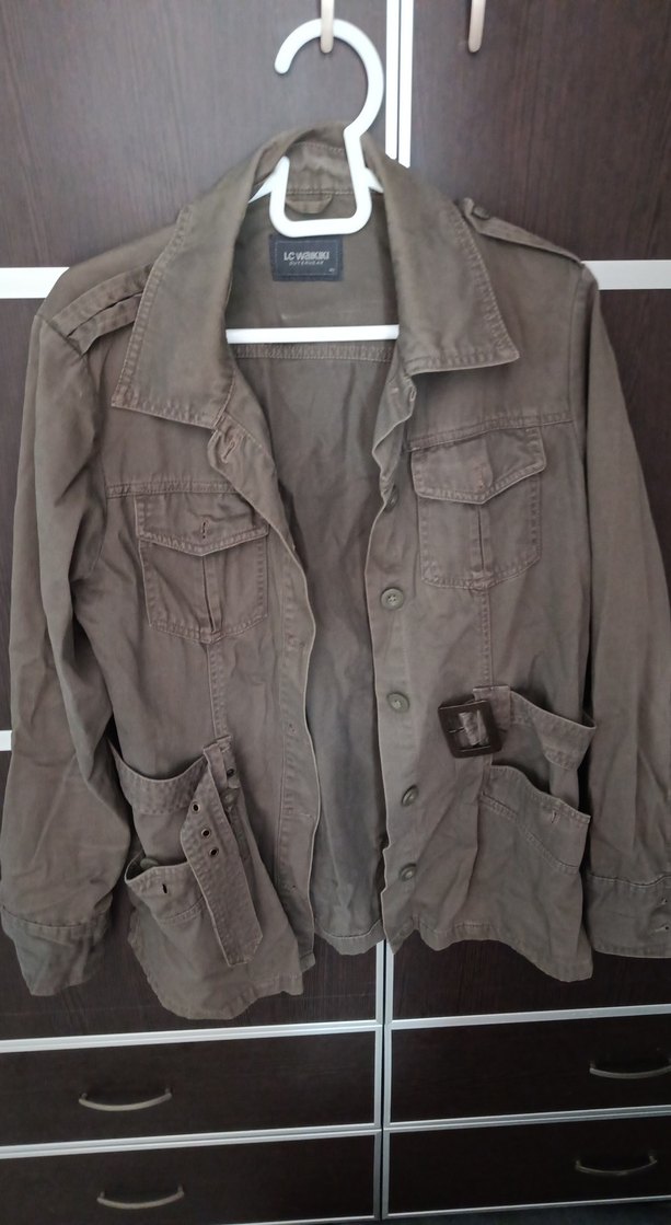 haki, keten kumaştan yapılmış, düğmeli, uzun kollu ve bol kesim kadın ceket. Notlu yaka ve kemer detaylarıyla rahat, günlük sokak stili için uygundur.