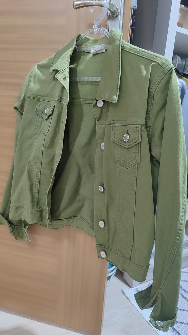 Haki renkli, düğmeli ve uzun kollu, fitted kesim kadın denim ceket. Notch yaka ve parlak görünümlü keten kumaştan üretilmiştir.