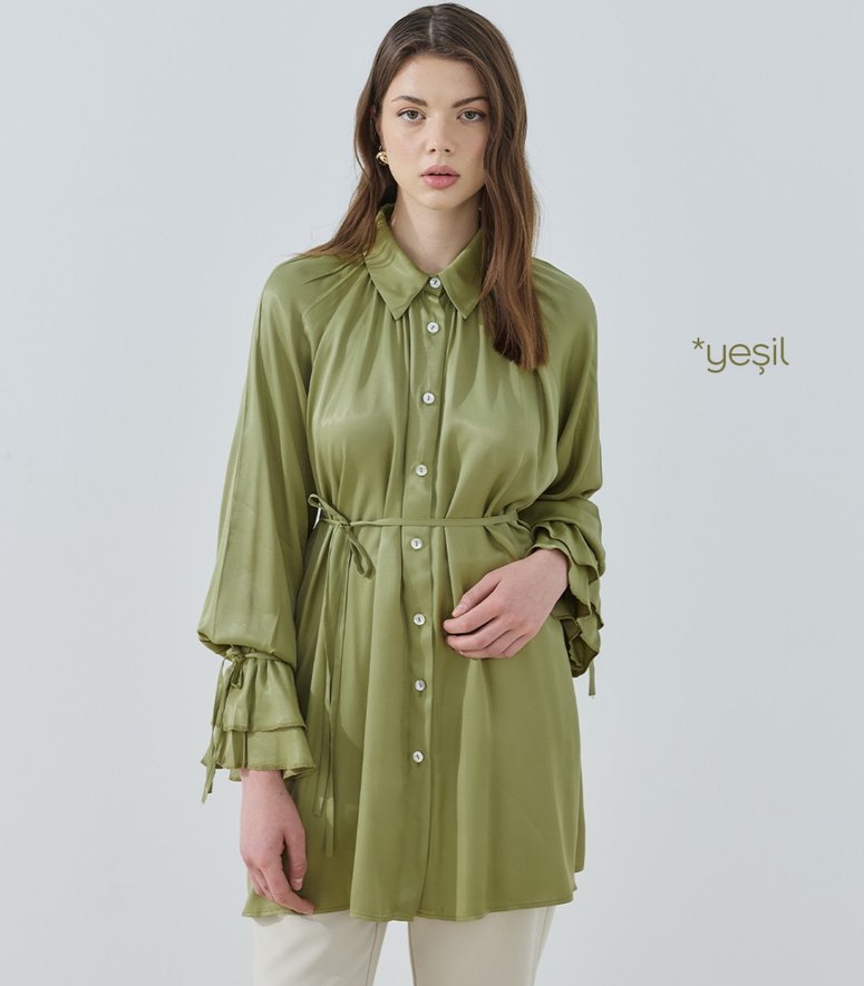 Düğmeli, uzun kollu, yakalı khaki kadın gömlek. Bol kesim, parlak ve ipeksi dokulu, midi boyda, desensiz ve ofis kullanımı için uygun.