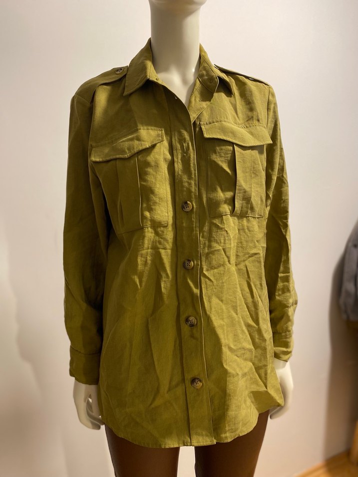 Düğmeli önü, uzun kollu, haki renk keten gömlek. Notlu yaka ve cep detaylarıyla rahat kesim, vintage tarzda günlük kullanıma uygun.