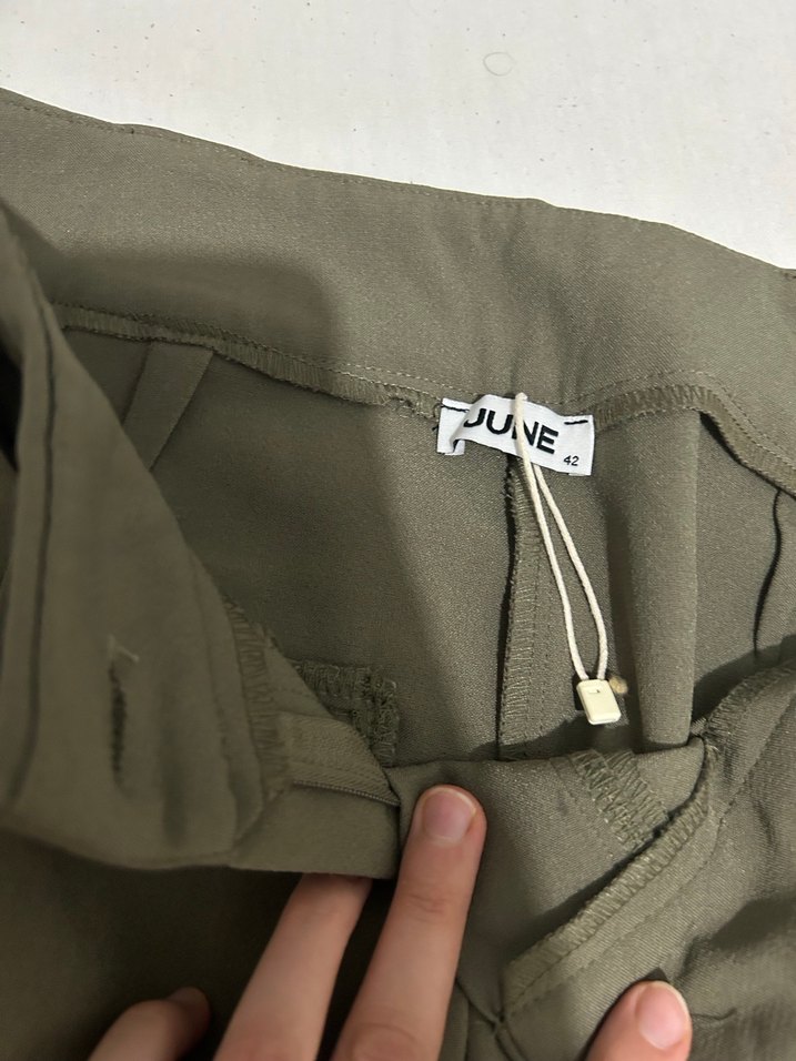 Düğmeli, bol kesim haki keten pantolon, midi boyda, günlük rahat kullanıma uygun sade tasarım.