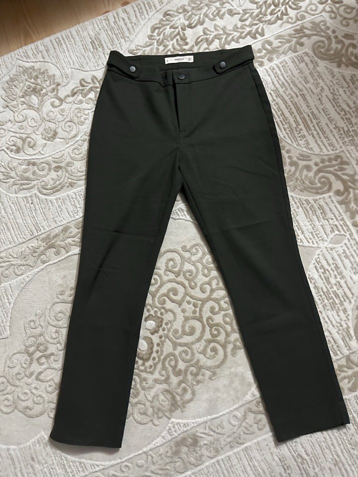 Düğmeli, haki yeşil renkte, düz kesim kadın kumaş pantolon. Ofis kullanımı için uygun, midi boy ve sentetik yumuşak kumaştan.