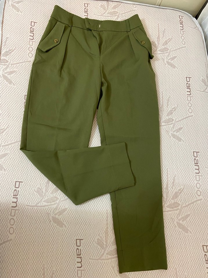 Düğmeli detaylara sahip haki renk kadın pantolon, normal boy midi kesim ve parlak sentetik kumaştan üretilmiştir. Minimalist ve trend günlük kullanıma uygun. ✨