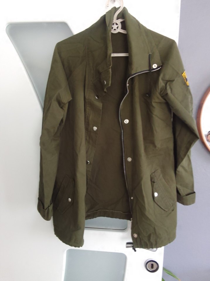 Düğmeli, haki renkte kadın midi ceket. Notlu yakalı, bol kesim ve uzun kollu. Parlak görünümlü, günlük kullanıma uygun rahat kumaştan üretilmiştir. M/L beden