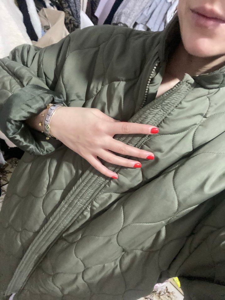 Düğmeli önü, boğazlı yaka ve uzun kollu haki kadın midi ceket. Bol kesim ve parlak sentetik kumaştan, trend sokak stili için uygundur. Mlla marka hafif oversize incedir