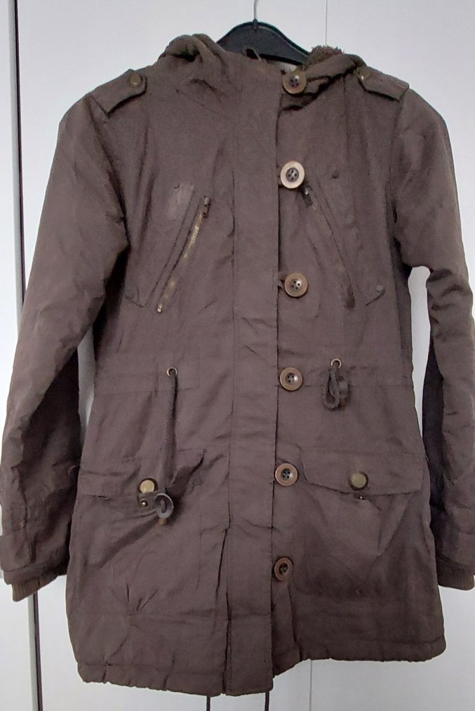 Düğmeli, haki kumaştan, normal boy midi ceket. Notlu yakalı, uzun kollu, sokak stiline uygun, günlük kullanıma uygun. İçi kürklü.S-M beden