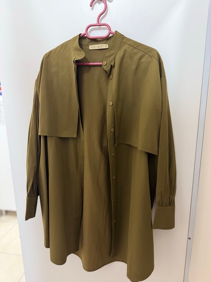 Düğmeli, uzun kollu, yakalı ve saten dokulu haki renk midi gömlek. Salaş kesimiyle rahat ve şık bir günlük tercih. Heqa