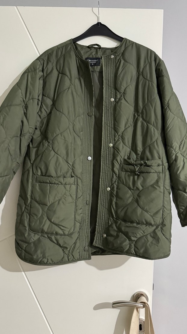 Düğmeli, bol kesim, uzun kollu haki renk kadın midi mont. Sentetik kumaştan, yakası kesik ve sokak stili rahatlığı sağlar.