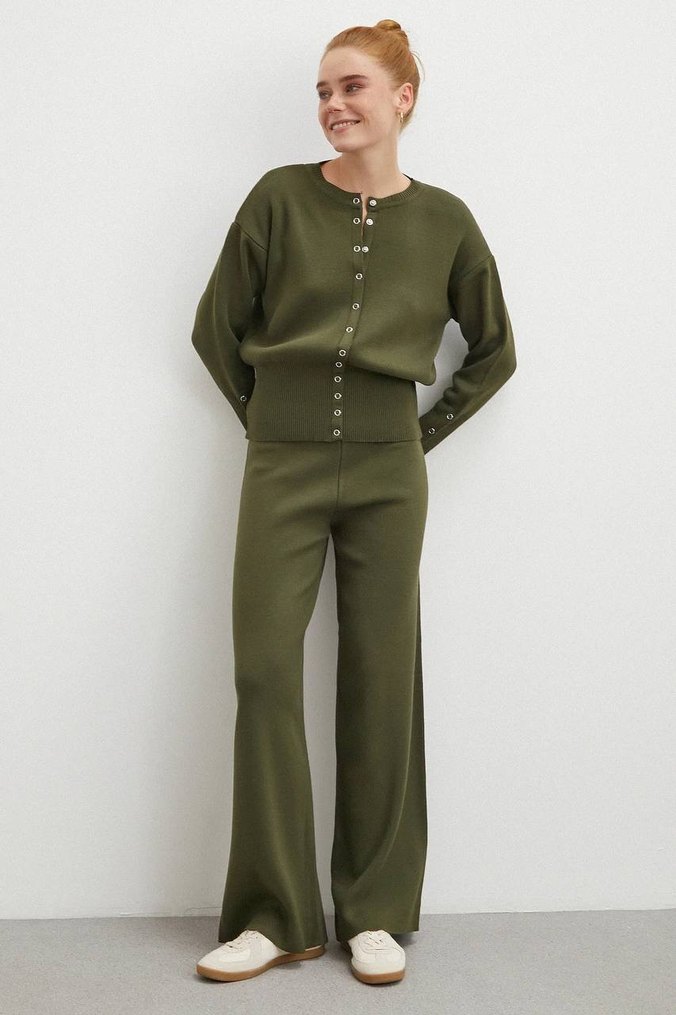 Düğmeli önü ve uzun kollu triko kumaşlı haki kadın eşofman takımı, rahat kesimi ve midi boy pantolonu ile günlük kullanıma uygundur.