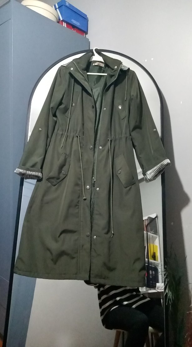 haki yeşili düğmeli ve uzun kesim kadın montudur. Notched lapel yakalı, bol kesim ve uzun kolludur. Rahat sokak stili için uygundur.