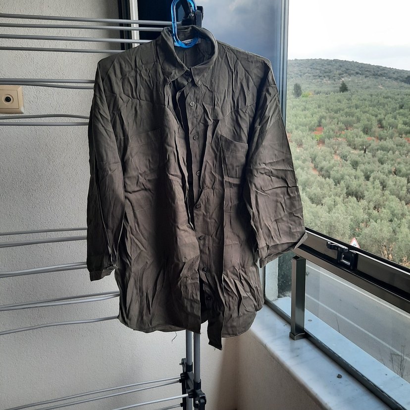 haki keten kumaştan, düğmeli, uzun kollu, normal boy midi kesim kadın gömlek. Salaş kesimi ve yaka detayları ile sokak stiline uygun.
